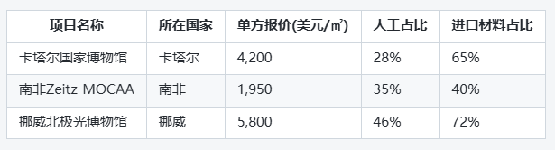 五、政策環(huán)境與隱性成本的影響 1. 行政審批效率與尋租成本 在迪拜,博物館項(xiàng)目可通過“黃金簽證”通道快速獲得施工許可,全程不超過30天;而巴西里約熱內(nèi)盧的歷史建筑改造審批平均耗時(shí)8個(gè)月,期間產(chǎn)生的貸款利息、場(chǎng)地租賃費(fèi)等間接成本可達(dá)總投資的5%-7%。某些地區(qū)還存在非正式的“加急費(fèi)”現(xiàn)象,進(jìn)一步扭曲報(bào)價(jià)構(gòu)成。